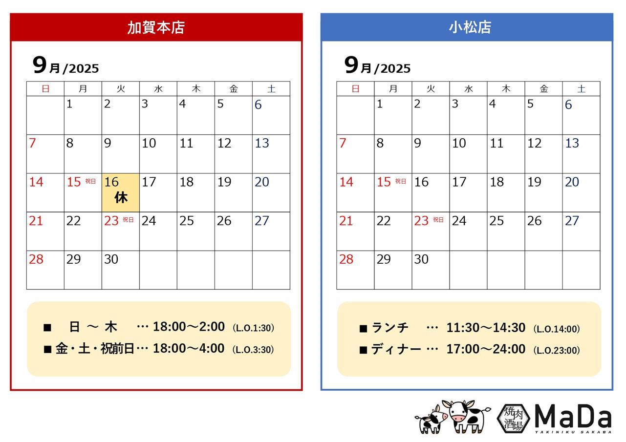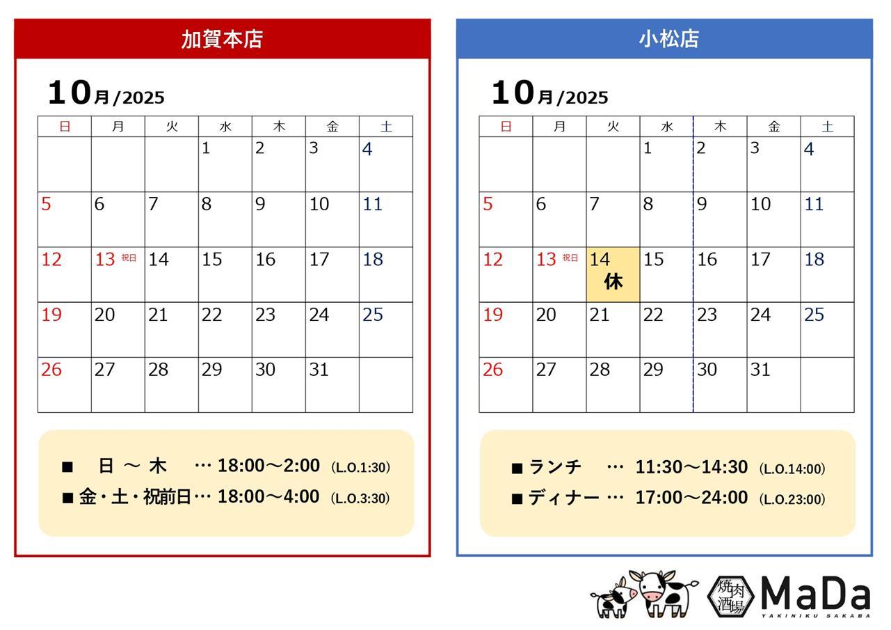 いつも焼肉酒場MaDaをご利用いただきまして誠にありがとうございます。10月 店休日のお知らせです。《加賀本店》10月休まず営業いたします💪🏻❤️🔥《小松店》10月14日(火) お休みさせていただきます🙇🏻お席のご予約はお電話またはネット予約より承っております!当日のご予約など、最新の空き状況につきましてはお電話にてお問い合わせいただけますと幸いです☺️■□■□■□■□■□━━━━━━━━━━━━━━━━━【LINE公式アカウント🐮】LINEから簡単にお席のネット予約ができるようになりました👏ショップカードで来店ポイントを貯めてクーポンゲット👍🏻 ✨こちらのリンク から友だち追加よろしくお願いします😊💕《加賀本店》👉 https://lin.ee/brnVtjK (ID:@544gqduh)《小松店》 👉 https://lin.ee/f0pdiRM (ID:@086nlcaa)【忘年会にも✨宴会ご予約承り中です🍺】コース料理や飲み放題プランございます!ご要望やお席のご希望などお気軽にご相談ください🐮✨【テイクアウトも🍖】おうち焼肉セットやお弁当のテイクアウト承っております!バーベキューやおうち焼肉で美味しい和牛や新鮮なホルモンをご用意したいときにはぜひご利用ください🐮✨━━━━━━━━━━━━━━━━━■□■□■□■□■□10月も皆様のご来店を心よりお待ちしております!