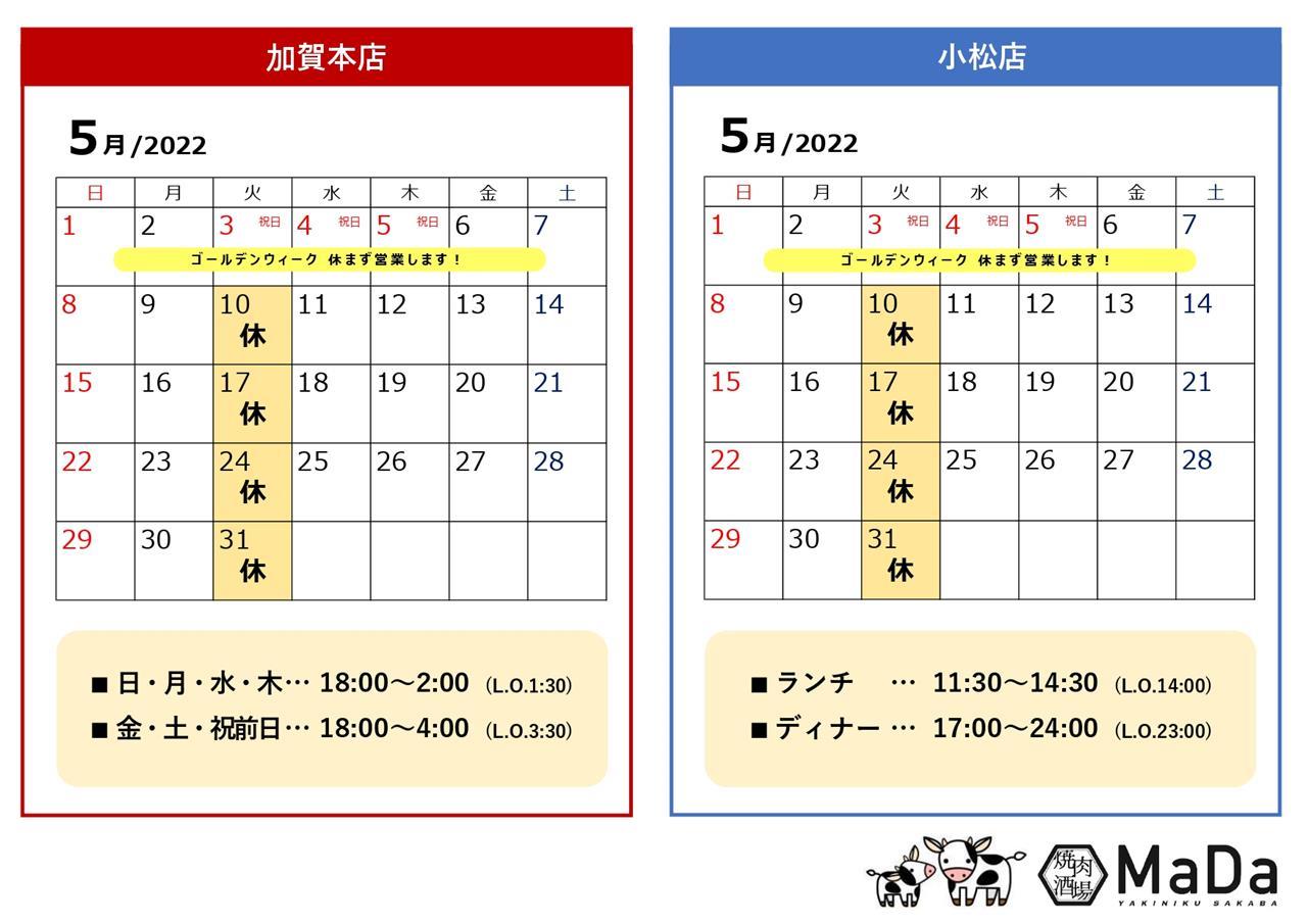 いつも焼肉酒場MaDaをご利用いただきまして誠にありがとうございます。5月の営業日のご案内です。加賀本店、小松店ともにゴールデンウイークは休まずに営業いたします!店内でのご飲食はもちろん、おうち焼肉セットやお弁当のテイクアウトもいつでも承っております。5月も皆様のご来店を心よりお待ちしております!
