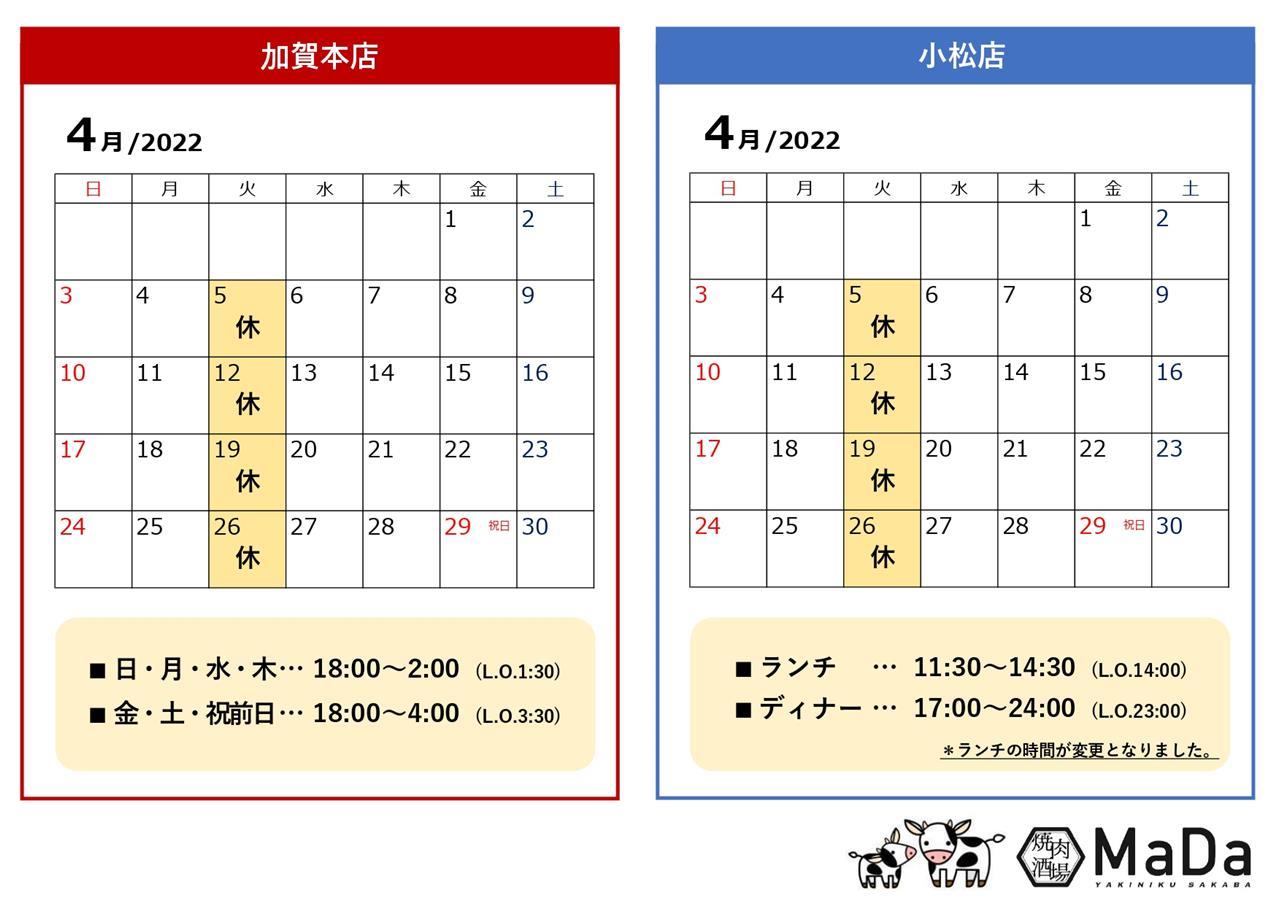 いつも焼肉酒場MaDaをご利用いただきまして誠にありがとうございます。4月の営業日のご案内です。加賀本店、小松店ともに火曜定休日となります。また、4月より小松店のランチタイムが変更となります。変更前・12:00~15:00(L.O.14:30)変更後・11:30~14:30(L.O.14:00)4月も皆様のご来店を心よりお待ちしております!