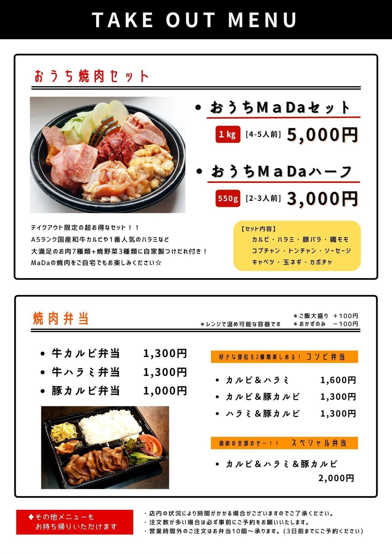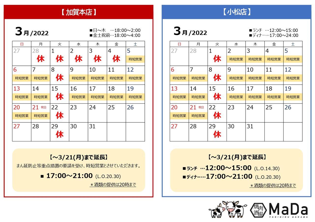いつも焼肉酒場MaDaをご利用いただきまして誠にありがとうございます。3月の店休日のご案内です。《加賀本店》・3月1日(火)~4日(金)・3月8日(火)・3月15日(火)・3月22日(火)・3月29日(火)《小松店》・3月1日(火)・3月8日(火)・3月15日(火)・3月22日(火)・3月29日(火)また3月6日までは、まん延防止等重点措置の要請を受け21:00までの時短営業を行っております。ご不便をおかけしますがご理解ご協力のほどお願い申し上げます。 →【 ※ ~3/21(月)まで再延長となります】時短営業の期間中もお弁当やおうち焼肉セットなどテイクアウトも承っておりますのでぜひご活用ください!皆様のご利用を心よりお待ちしております!