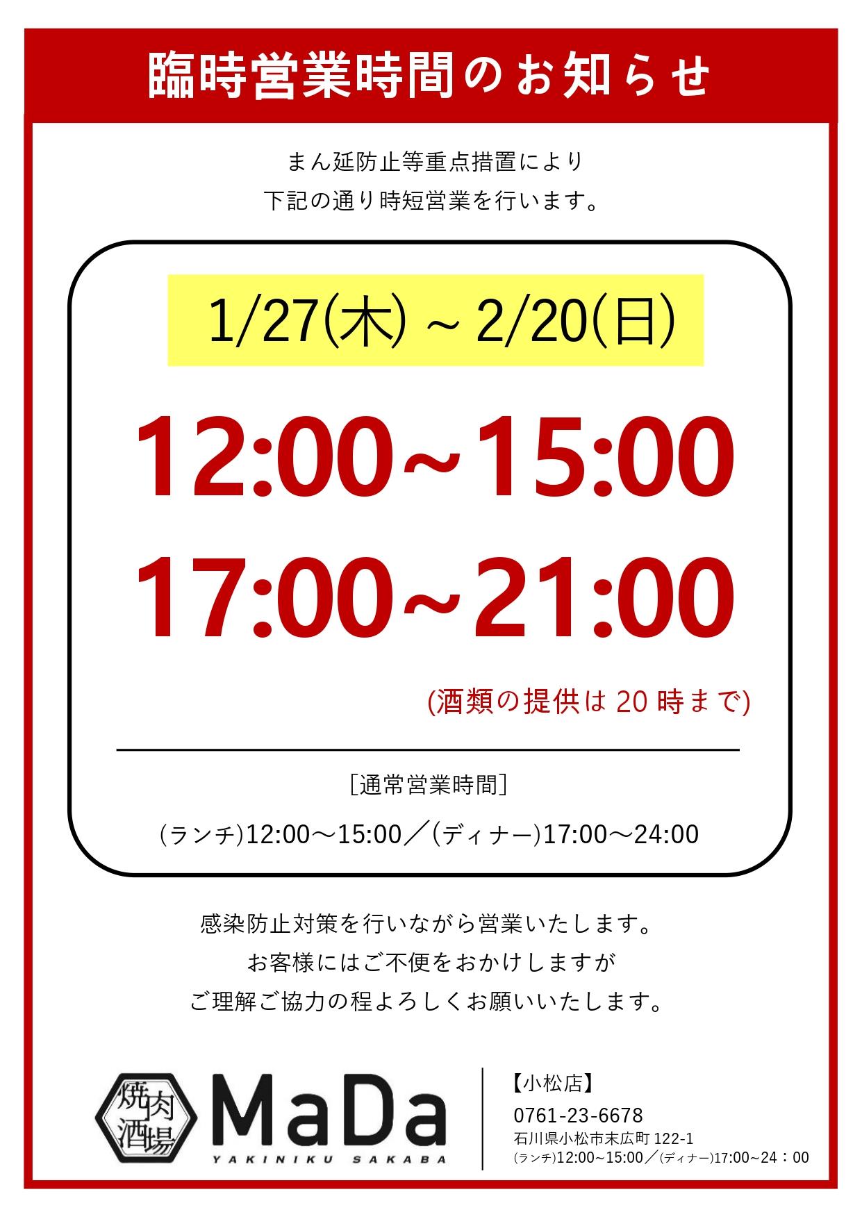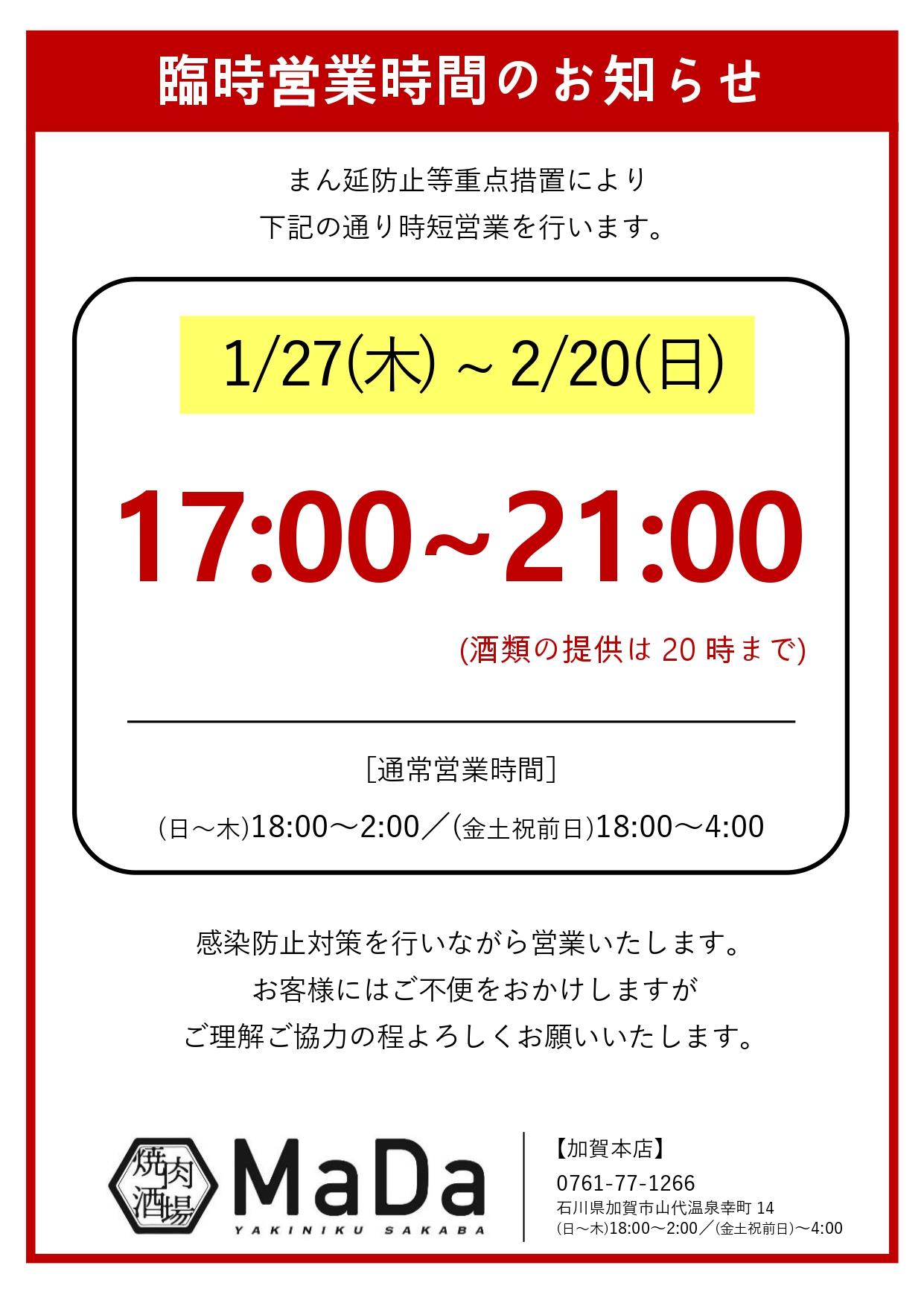 いつも焼肉酒場MaDaをご利用いただきまして誠にありがとうございます。まん延防止等重点措置を受け、1/27(木)~2/20(日)の間、時短営業とさせていただきます。【加賀本店】17:00~21:00 (酒類の提供20時まで)【小松店】・ランチ :12:00~15:00 (通常通り)・ディナー:17:00~21:00 (酒類の提供20時まで)感染防止対策を行いながら営業いたします。ご不便をおかけしますがご理解ご協力くださいますようお願い申し上げます。