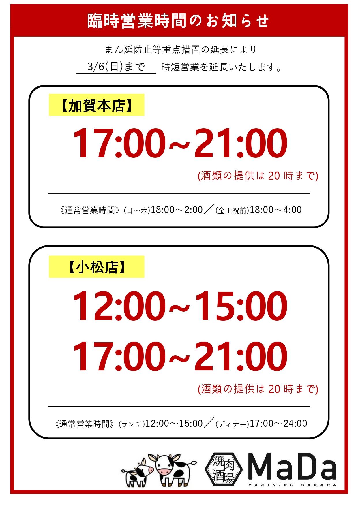 いつも焼肉酒場MaDaをご利用いただきまして誠にありがとうございます。石川県のまん延防止等重点措置 延長に伴い、現在行っている時短営業を3月6日(日)まで延長いたします。【加賀本店】17:00~21:00 (酒類の提供20時まで)【小松店】・ランチ :12:00~15:00 ・ディナー:17:00~21:00 (酒類の提供20時まで)感染防止対策を行いながら営業いたします。ご不便をおかけしますがご理解ご協力くださいますようお願い申し上げます。加賀本店、小松店ともにテイクアウトのご注文も承っておりますのでぜひご活用ください!皆様のご来店を心よりお待ちしております!