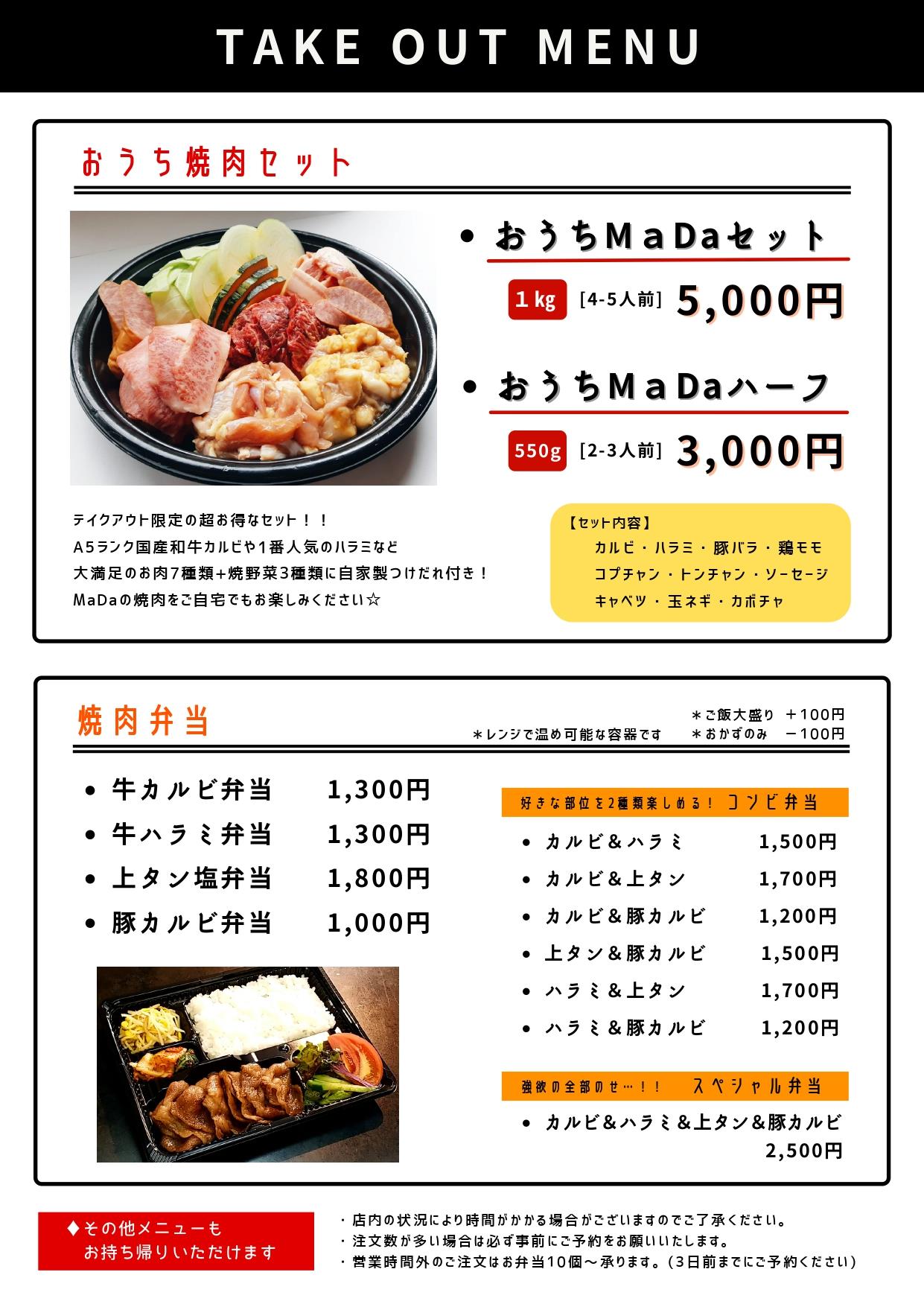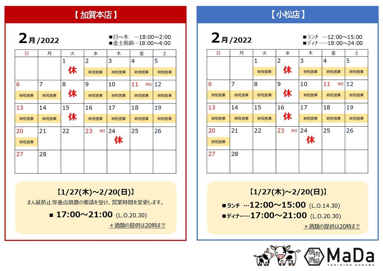 いつも焼肉酒場MaDaをご利用いただきまして誠にありがとうございます。2月の店休日についてご案内いたします。《加賀本店》・2月1日(火)・2月8日(火)・2月15日(火)・2月24日(木)《小松店》・2月2日(水)・2月9日(水)・2月16日(水)・2月24日(木)上記の日にちお休みさせていただきます。また、1月27日~2月20日の期間はまん延防止等重点措置の要請を受け、21:00までの時短営業を行っております。ご不便をおかけしますがご了承のほどお願い申し上げます。時短営業の期間中もお弁当やおうち焼肉セットなどテイクアウトも承っておりますのでぜひご活用ください!皆様のご利用を心よりお待ちしております!