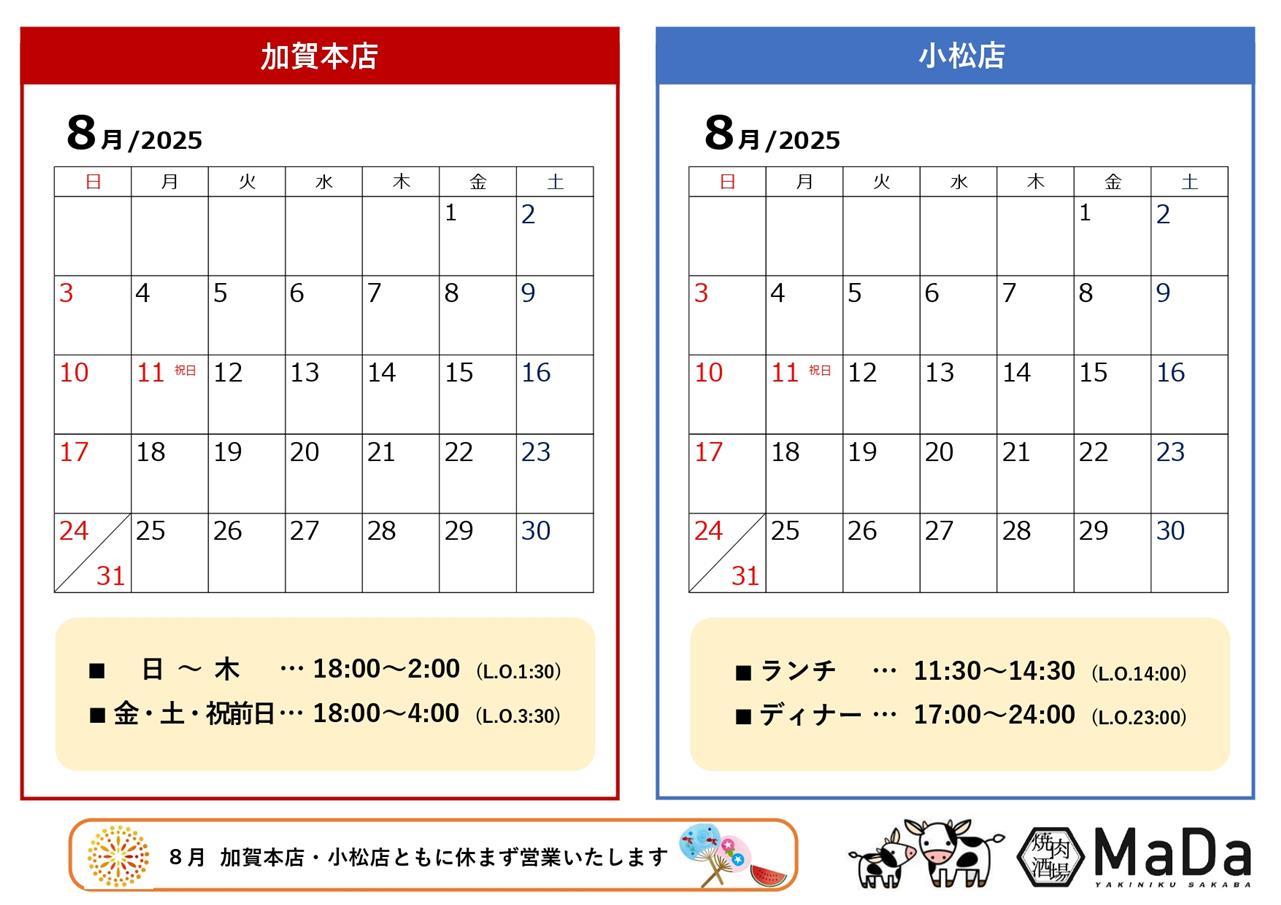 8月 営業日のお知らせ